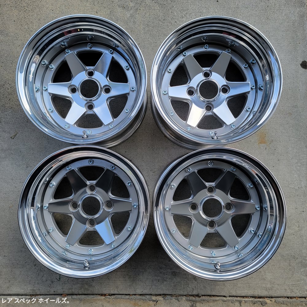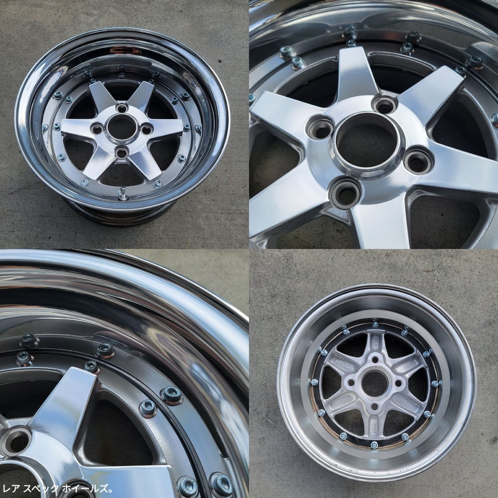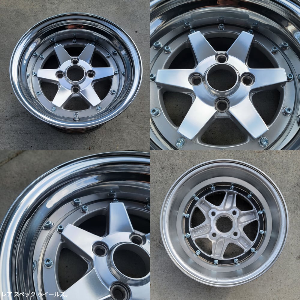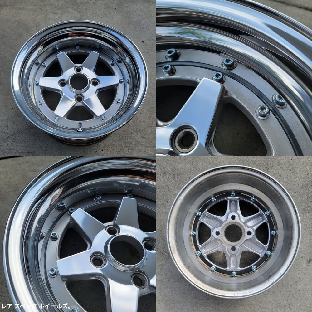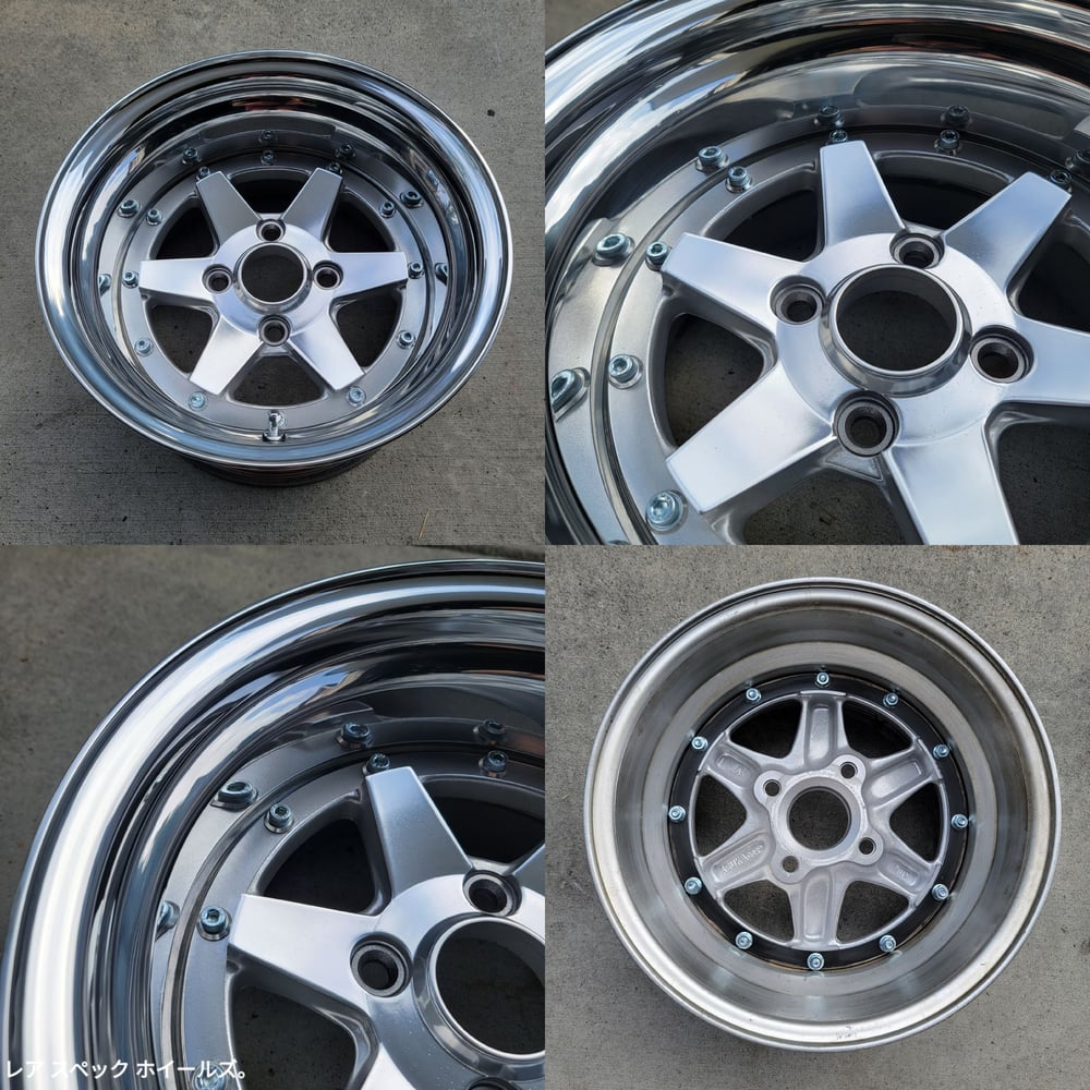 Originally, these were two pairs of 14x6.5s that were mated together. The wheels were fully split and stripped. Custom made polished 4" and 4.5" outers were welded back onto the barrels. Faces were hand polished, tumbled, and Cerakoted clear. New M8 zinc plated bolts, new M8 nuts, cone washers and new valve stems installed. These are very similar to the XR-4, however, the face is mounted on top and is removable.