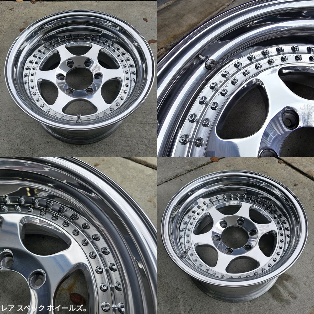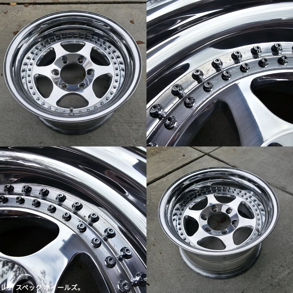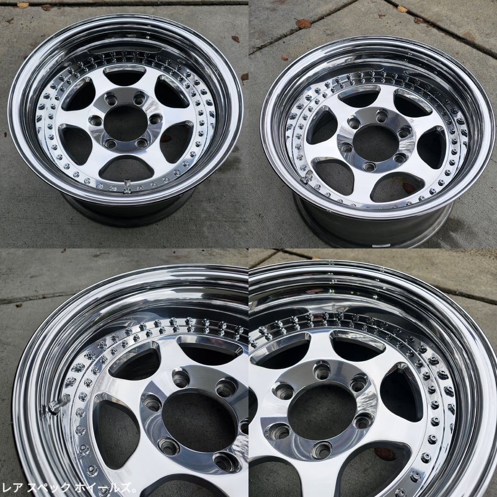 Made in Japan. 3pc construction. This set was fully stripped and hand polished. One wheel has both new inner and outer (remaining 3 are original, welded from factory). All new M6 chrome hardware. New Valves.